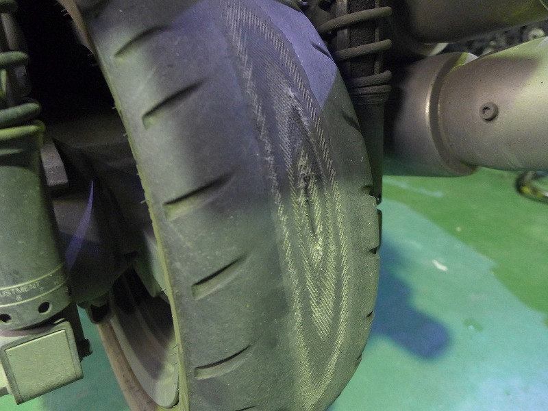 リヤタイヤは、糸が出てしまいパンクです。