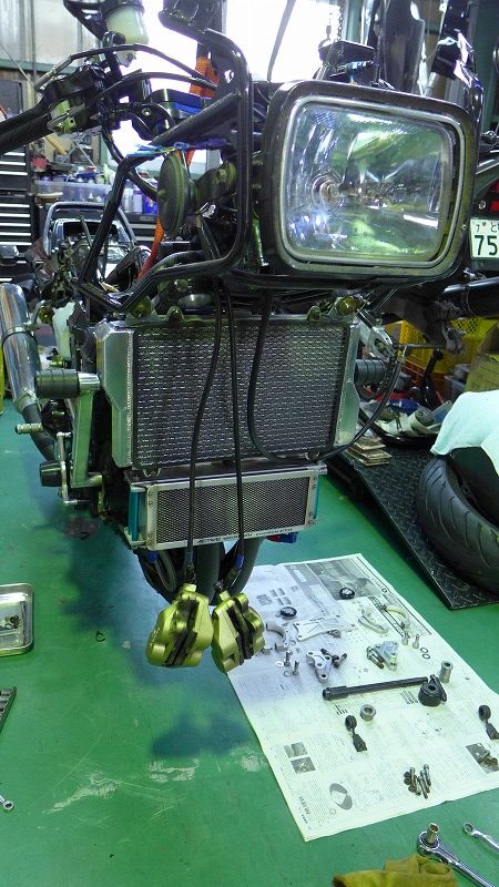 ラジエター、フロントリヤディスク、タイヤ、ホイールベアリング交換、フォークオイル交換等です。