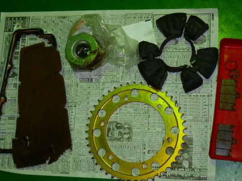 整備交換部品は、エンジンオイル(ワコーズTR)オイルフィルター、クーラント、プラグ、FRブレーキクラッチフルード、エアクリーナーエレメント、Rスプロケット、リヤハブダンパー、バッテリー等です。